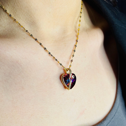 Altın Kapama Fiyonklu Mor Kalp Kolye