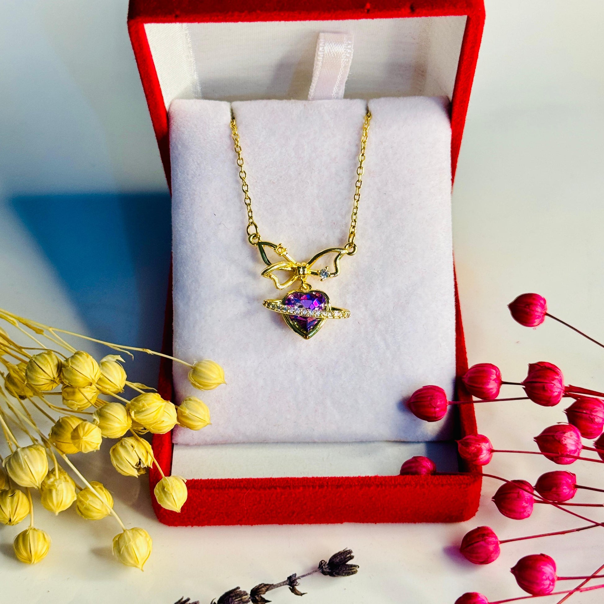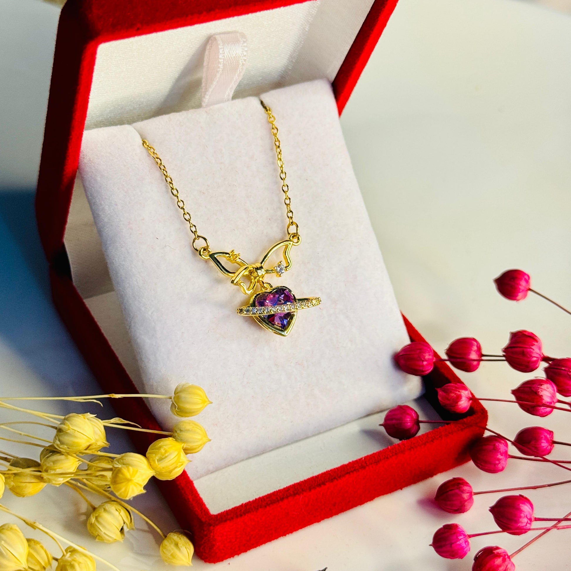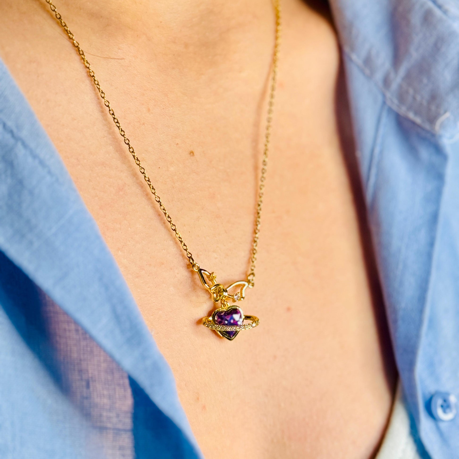 Altın Kapama Fiyonklu Mor Kalp Kolye